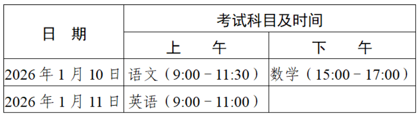 我省2026年普通高等学校招收中等职业学校毕业生统一考试(简称“3+证书”考试)定于2026年1月10日至11日举行,具体考试科目及时间安排如下: