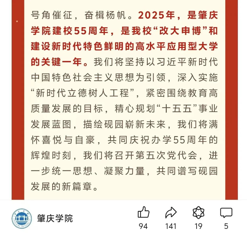 1月,学校在新年贺词中提到:2025年是肇庆学院建校55周年,是学校“改大申博”和建设新时代特色鲜明的高水平应用型大学的关键一年