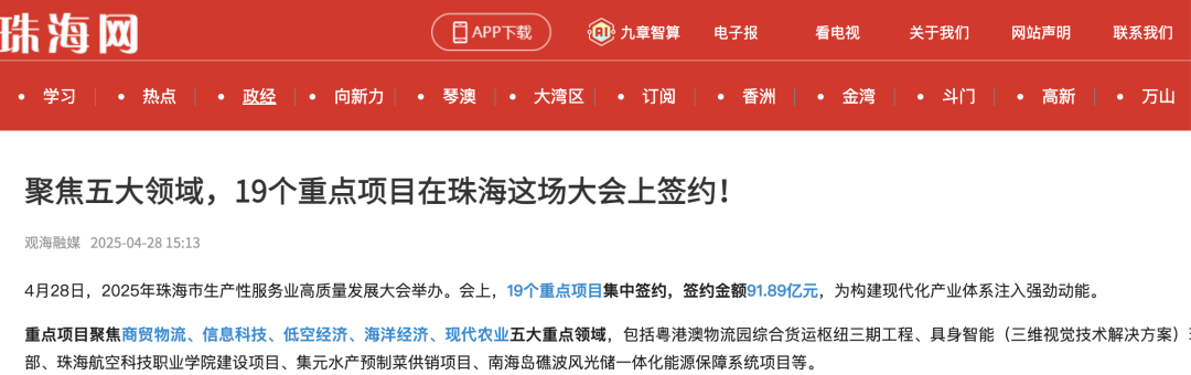 据相关媒体报道,4月28日,2025年珠海市生产性服务业高质量发展大会举办。会上19个重点项目集中签约,签约金额91.89亿元。珠海航空科技职业学院就是其中之一。