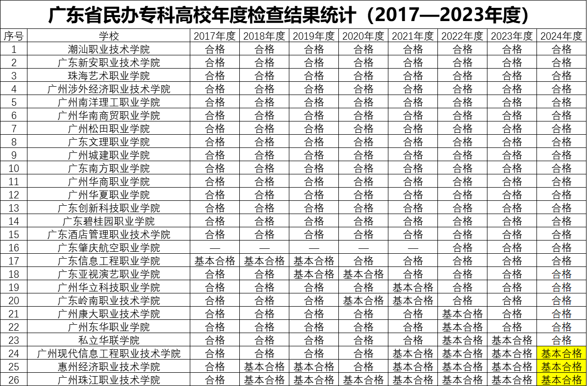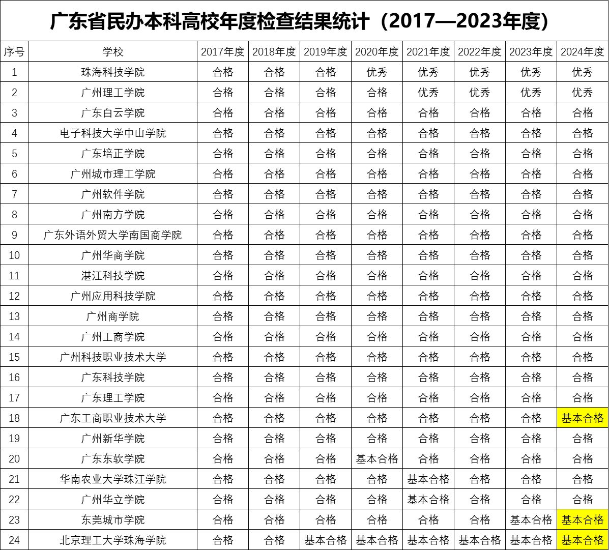 • 虽然近8年来没有高校在年检中被评为“不合格”,但却也有部分高校已经在最近2年被连续评为“基本合格。它们分别是:北京理工大学珠海学院、东莞城市学院、惠州经济职业技术学院、广州现代信息工程职业技术学院、广州珠江职业技术学院。值得一提的是,广州珠江职业技术学院自2018年度至今,已经连续7年被评为“基本合格”