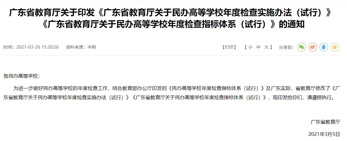 在2021年3月,省教育厅发布了民办高校年度检查相关的实施办法和指标体系。其中明确规定: