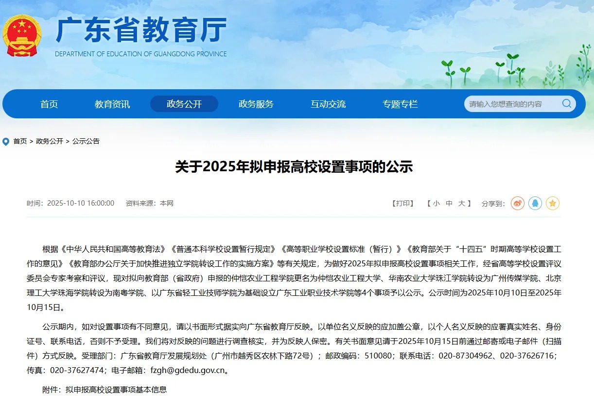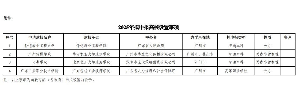 10月10日,广东省教育厅发布公示,拟以现有学校为基础新设1所高校,转设2所高校,更名1所高校: