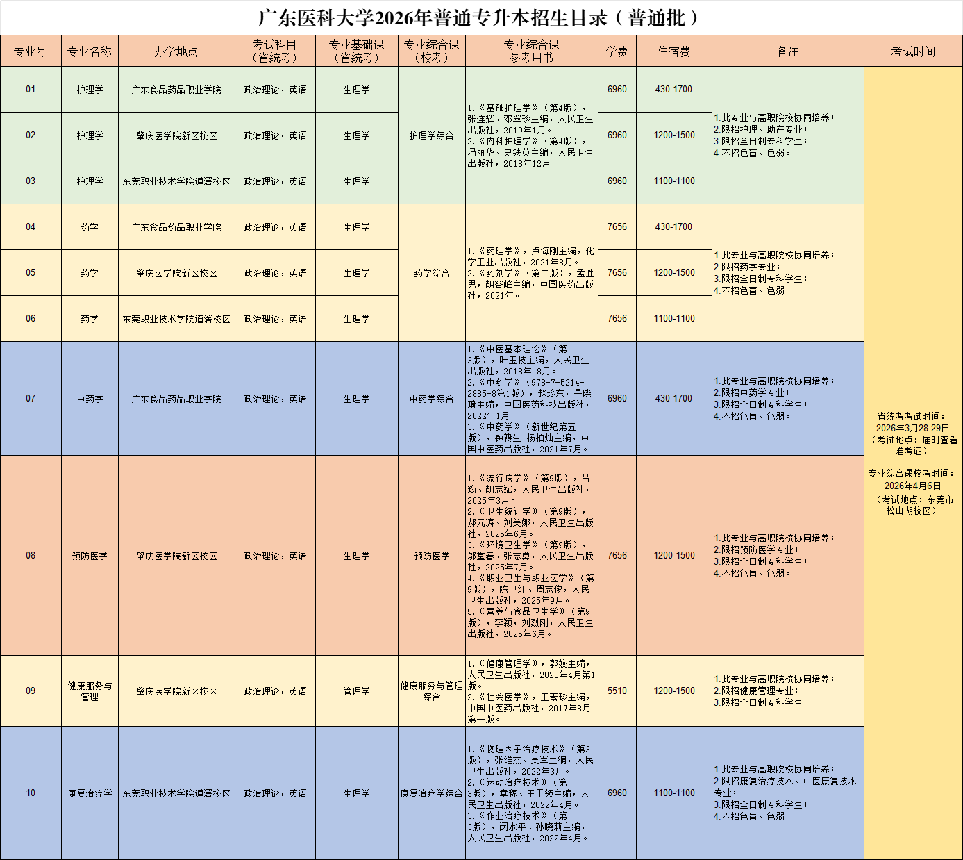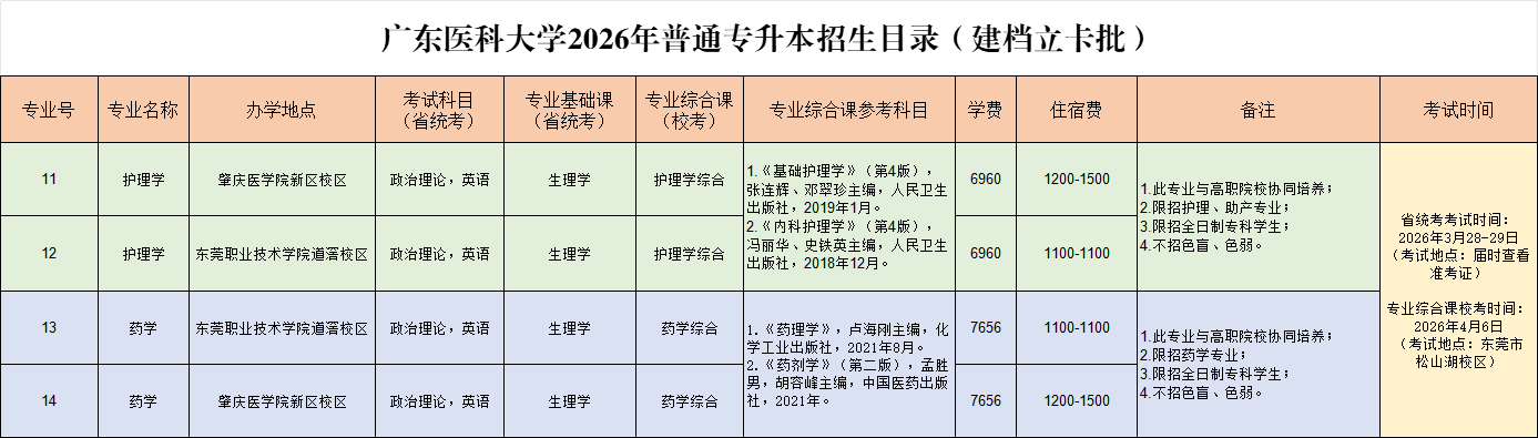 对符合我省普通专升本招生报考相关规定,并获得中国国际大学生创新大赛(原中国国际“互联网+”大学生创新创业大赛)(高教主赛道、青年红色筑梦之旅、职教赛道、产业命题赛道)(以下简称中国国际大学生创新大赛)或教育部等部门主办的全国职业院校技能大赛(以下简称全国职业院校大赛)或世界职业院校技能大赛总决赛争夺赛(以下简称世界职业院校技能大赛)或人力资源社会保障部主办的中华人民共和国职业技能大赛(以下简称全国职业技能大赛)奖项的考生,可在其文化课省统考成绩总分的基础上增加分值投档,具体详见《广东省2026年普通高等学校专升本招生工作规定》。 六、志愿填报 2026年普通专升本实行考后知分填报志愿,考试成绩公布后,考生根据自身实际,按院校专业组模式进行志愿填报。 (一)志愿设置。普通批设置10个院校专业组志愿,建档立卡批次设置5个院校专业组志愿。每个院校专业组最多可填报4个专业志愿及1个是否服从调剂选项。 (二)志愿填报。考生只能按自身报考的考试科目组选择相应院校专业组志愿及专业志愿进行填报,参加了专业综合课省统考或招生院校自行组织命题科目考试的考生,可同时填报提前批、普通批和建档立卡批次中符合条件的院校专业组。 志愿填报的具体安排和要求在考试成绩公布后省教育考试院另文通知。 七、录取 (一)普通专升本招生由省招生委员会办公室根据年度普通专升本招生计划和考生成绩情况,按考生类别(建档立卡考生、普通考生等)、专业基础课分别划定三科总分(2门公共课+1门专业基础课)和专业综合课两条最低控制分数线。 (二)根据平行志愿投档原则,对两条最低控制分数线均已上线的考生,按其四科总分和院校专业组计划1:1比例,由高分到低分进行投档。即依照“分数优先,遵循志愿”的原则和院校专业组计划,按考生成绩排位情况从高到低检索,排位靠前的考生优先检索,再按考生填报的院校专业组志愿逐个检索,在考试科目组符合的前提下,按我校专业组计划1:1比例从高到低投档,由我校在投出的考生中按照招生简章择优录取,不得跨院校专业组录取或调剂。 (三)考生成绩排位规则如下: 1.不同科目组(含省统考科目组和院校自命题科目组)分开、单独排位。 2.根据考生四科总分(含加分)从高到低确定投档位序。四科总分(含加分)相同时,比较四科总分(不含加分)高低,高者优先。 四科总分(不含加分)仍相同时,比较三科总分高低,高者优先。 三科总分(不含加分)仍相同时,按以下原则进行排序: 第一位序,比较专业基础课成绩高低,高者优先。 第二位序,比较公共课中政治理论科目成绩高低,高者优先。 第三位序,除外国语言文学类中非英语类专业外,比较公共课中英语科目成绩高低,高者优先。外国语言文学类中非英语类专业,比较专业课成绩高低,高者优先。 第四位序,比较专业综合课成绩高低,高者优先。 第五位序,单科成绩均相同的同时投档。 增加三科总分排名,排位规则参照上面执行。 (四)根据《教育部办公厅关于做好有关高校保送录取世界技能大赛获奖选手工作的通知》(教学厅〔2020〕3号)精神,符合上述相应报考条件的高职应届毕业生,在世界技能组织主办的“世界技能大赛(World Skills Competition)”中获奖的中国国家代表队选手可以保送录取本科层次职业学校和应用型普通本科高校。 考生向我校提交相关资料申请保送生资格,经我校审核同意后,按规定进行公示,并向省招生办进行备案办理录取手续。 (五)按照教育部相关文件精神,我省将对原建档立卡贫困家庭(下称原建档立卡)考生按一定比例安排原建档立卡考生招生计划,实行计划单列,单独录取。 (六)我校专业综合课校考专业,不参与征集志愿录取。 八、收费标准 学费:护理学、中药学、康复治疗学专业6960元/年,药学及预防医学专业7656元/年,健康服务与管理专业5510元/年;住宿费按照合作院校收费标准收取,广东食品药品职业学院为430-1700元/年,肇庆医学院为1200-1500元/年,东莞职业技术学院为1100元/年。若2026年广东省政府有新的收费标准,按新标准执行。 九、在校学习期间的管理 (一)按照教育部的有关规定,普通高校在新生入学时要对新生专科学历等报名资料进行复核,复核未通过的不予新生学籍电子注册,并按规定取消入学资格。学生入学学籍注册后三个月内,招生院校应对学生人员身份、前置学历条件、身心健康情况等入学资格情况进行复查,复查不合格者,取消学籍。 (二)新生入学后的体检复检工作,由各普通高等学校按照有关规定组织进行。体检标准参照教育部、卫生部、中国残疾人联合会《关于印发〈普通高等学校招生体检工作指导意见〉的通知》(教学〔2003〕3号)、《教育部办公厅 卫生部办公厅关于普通高等学校招生学生入学身体检查取消乙肝项目检测有关问题的通知》(教学厅〔2010〕2号)及教育部《关于明确慢性肝炎病人并且肝功能不正常的具体判定标准的函》(教学司函〔2010〕22号)要求执行,复检不合格者取消入学资格。 (三)普通专升本录取的考生秋季入学,全日制脱产学习。学校对普通专升本学生可采取插班就读、独立编班等形式开展教育教学,并按普通高等教育学生相关管理办法管理。普通专升本学生毕业时,其毕业证书上标注“在本校XX专业专科起点本科学习”,学习时间按进入本科阶段学习和