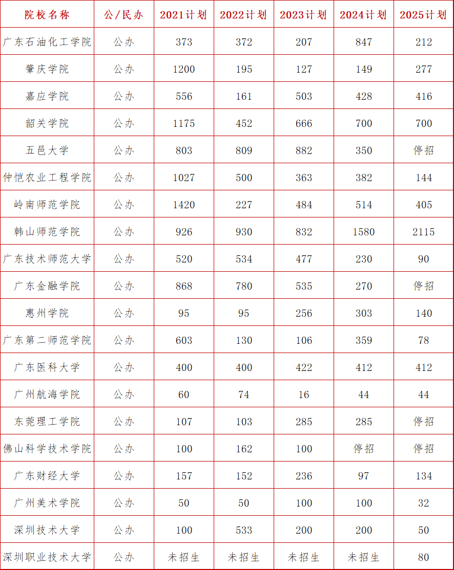 以2025年为例,广东石油化工学院从847人砍到212人,肇庆学院从700+压到277,连曾经“大户”的韶关学院,也连续三年卡在700,不再增加。