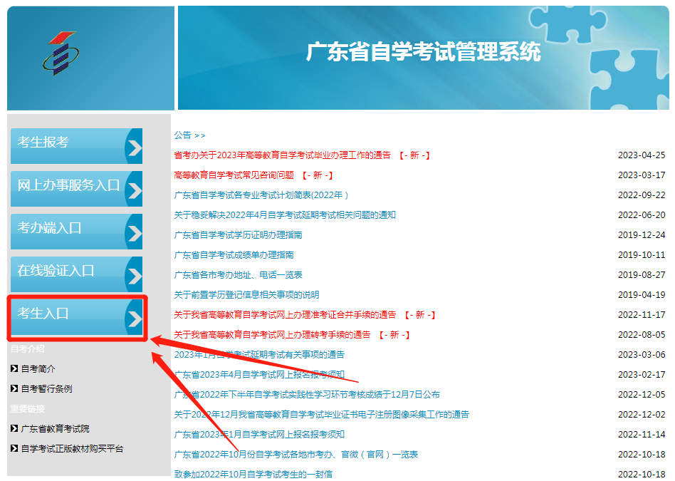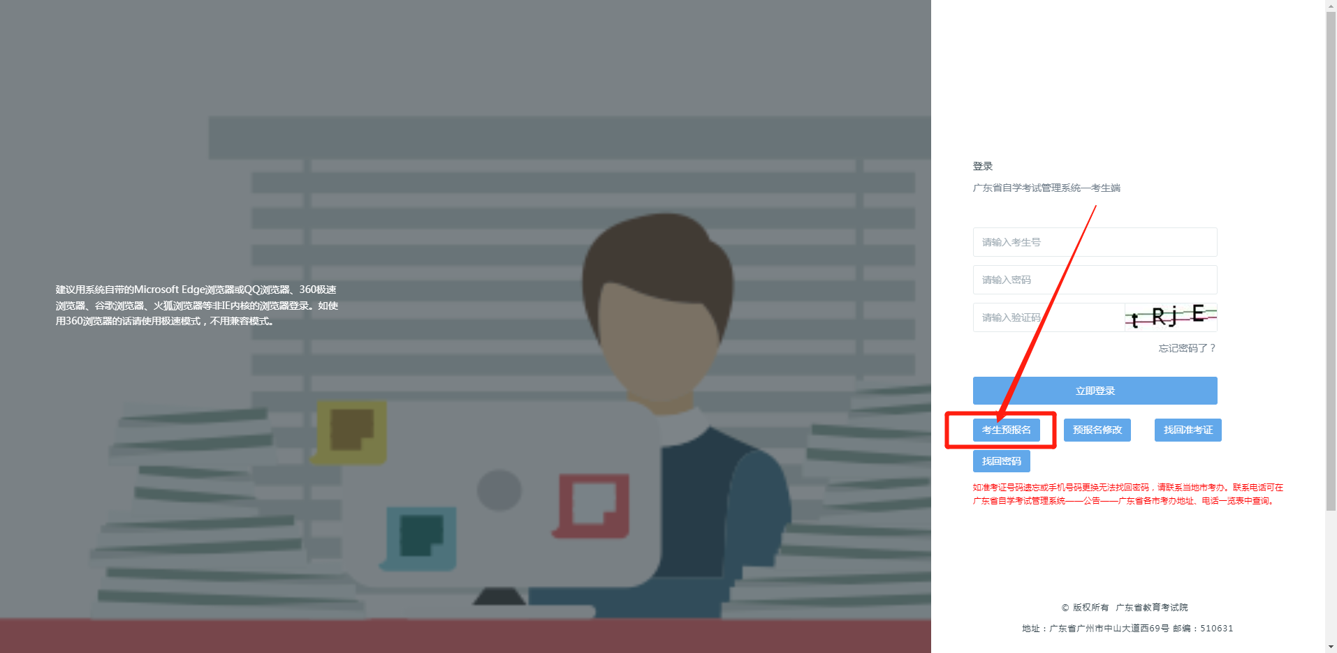 一、新生通过广东省自学考试管理系统,从【考生入口】通道进行预报名。预报名时考生须录入个人信息并设置个人密码,预报名成功后将得到唯一的预报名号。