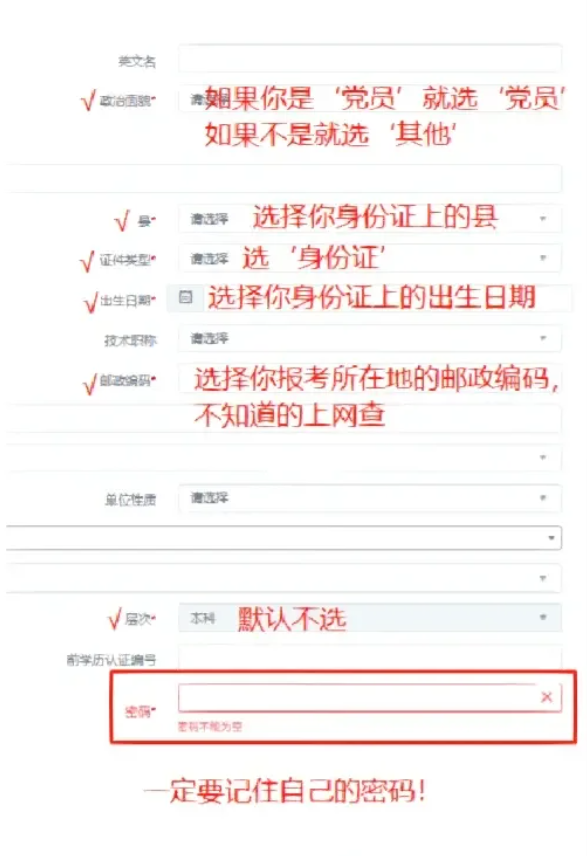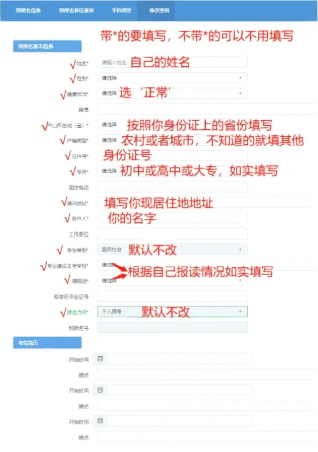 四、进入之后按照要求填写详细的个人信息后【提交】,保存好【预报名号】【密码】,填写信息内容较多,下面填写指导,考生可以参考填写,个人信息如实填写即可,其中带*为必填项,不带*号键可不填。(仅供参考)