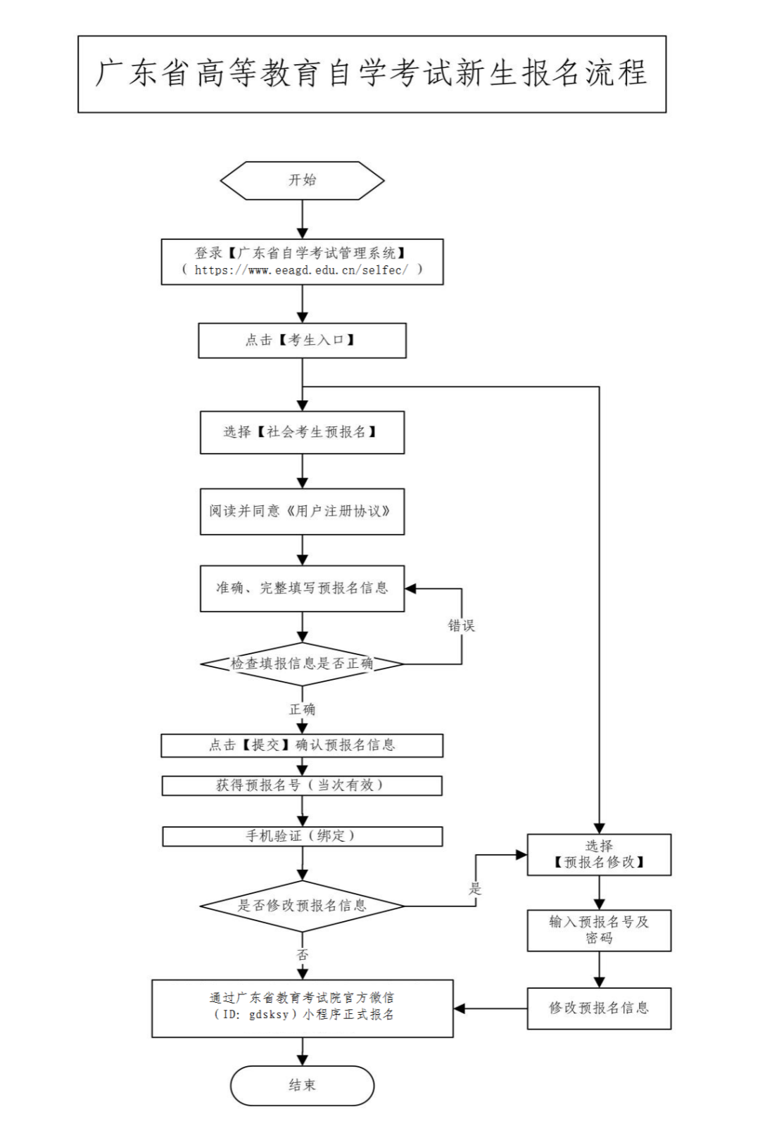 首次参加自学考试的新生报名分预报名和正式报名两个阶段具体流程如下所示: