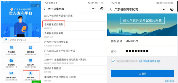 一、预报名成功之后,要进行考生正式报名,前往广东省教育考试院微信小程序进行【相片采集】,操作流程如下: